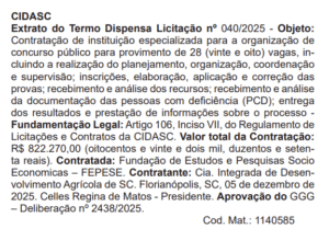 Na última sexta-feira (5), foi publicado no Diário Oficial de Santa Catarina o extrato do contrato que oficializa a Fepese como a instituição responsável pelo planejamento, organização, coordenação e supervisão do certame.