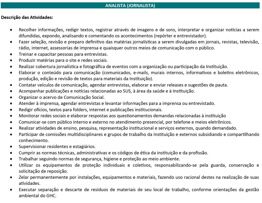 O Grupo Hospitalar Conceição, no estado do Rio Grande do Sul, divulgou o edital do processo seletivo com a oferta de oportunidade no cadastro de reserva para o cargo de Jornalista. O salário é de R$ 5.299,50 para uma jornada de trabalho de 150 horas mensais sob o regime da Consolidação das Leis Trabalhistas (CLT).