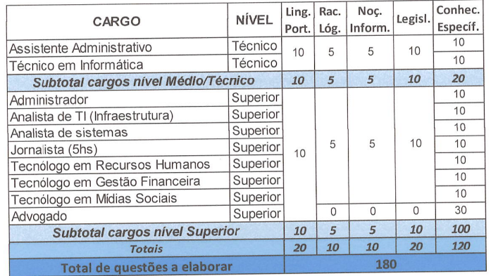 De acordo com o termo de referência, documento que traz detalhes sobre como será o concurso, o certame será composto por prova objetiva contendo 40 questões, sendo 10 de Língua Portuguesa; 5 de Raciocínio Lógico; 5 de Noções de Informática; 10 de Legislação; e 10 de Conhecimentos Específicos.