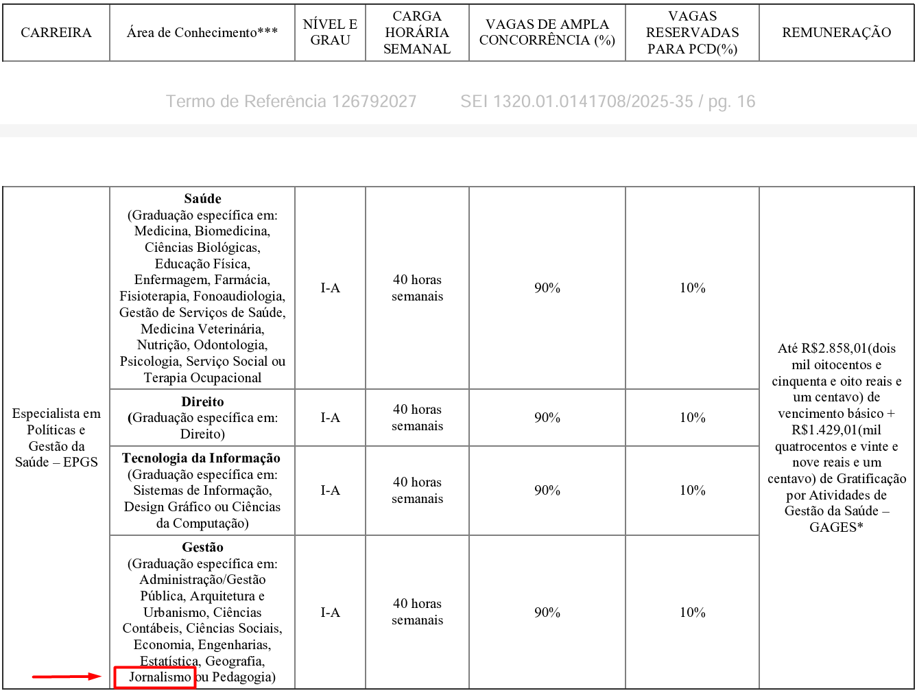 O cargo presente no concurso será o de Especialista em Políticas e Gestão da Saúde (EPGS) – Jornalista. A remuneração inicial é de R$ 4.287,02, composta pelo vencimento básico no valor de R$ 2.858,01 e Gratificação por Atividades de Gestão da Saúde (GAGES) de R$ 1.429,01. Além disso, o servidor fará jus a um auxílio-alimentação no valor de R$ 1.650,00.